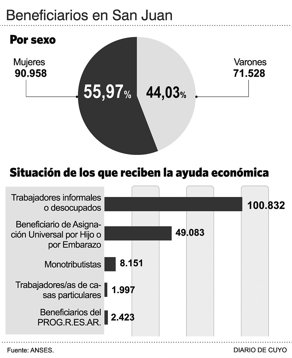 El análisis de los números también permite conocer que la mayor parte, el 55,97% son mujeres y que el 44,03% restante son hombres. Además, a esta tercera cuota del ingreso, que comenzó a abonarse en junio, lo recibe el 35,6% de los sanjuaninos que tienen entre 18 y 65 años.