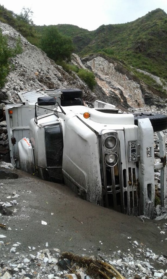 En las imágenes se ve un camión tapado de barro, agua y piedras, perteneciente a la empresa Ceras Argentinas, que llevaba cuarzo. Es un vehículo que cargado pesa unas 10 toneladas.