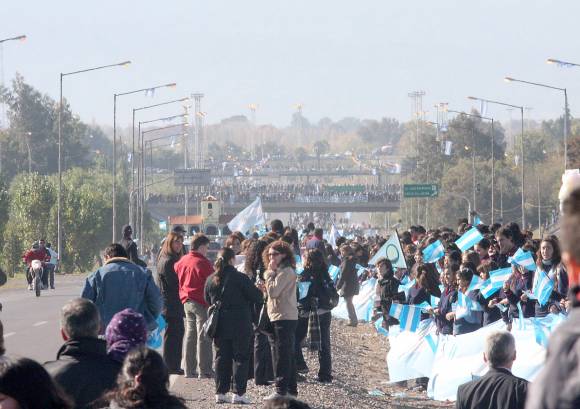 Cuarenta minutos antes de que comenzara a cantarse el Himno (que fue seguido por las 100.000 personas gracias a los parlantes instalados en toda la autopista), todavía seguía llegando gente desde todos los puntos cardinales. Eran familias enteras vestidas con los colores patrios, con changuitos que llevaban banderitas como mascarones de proa, muchos con reposeras y sillas para ablandar la espera. Debajo de los puentes, el humo de los choripanes se mezclaba con el Sol radiante pese al aire bien frío. Y arriba, los vendedores de banderas, de algodón y de pochoclo iban de puente a puente buscando clientes.