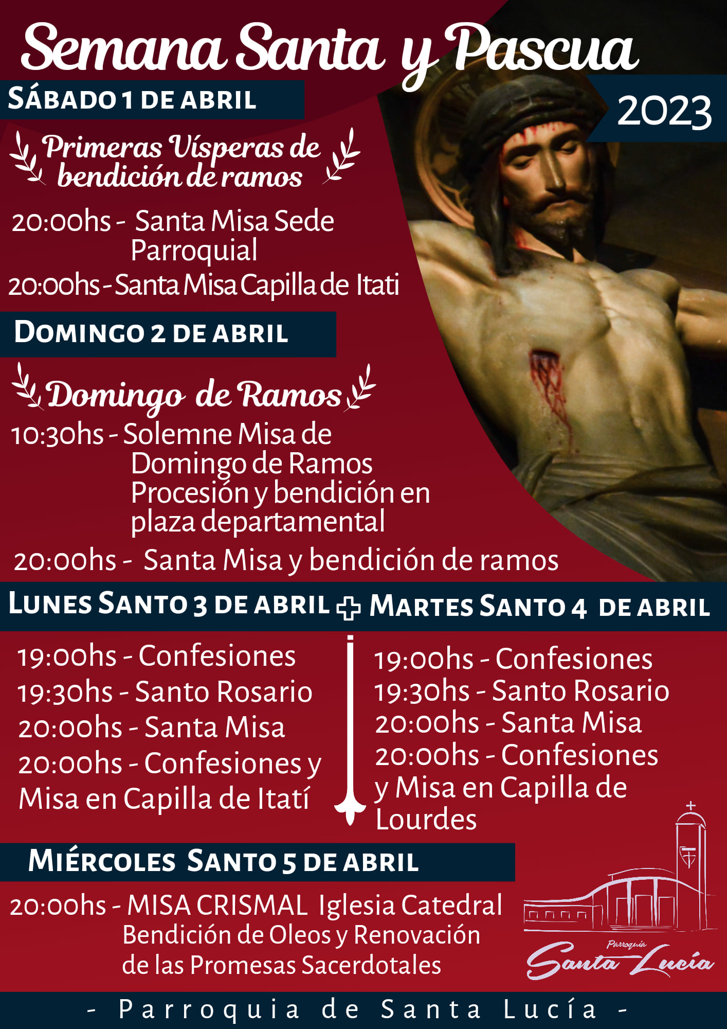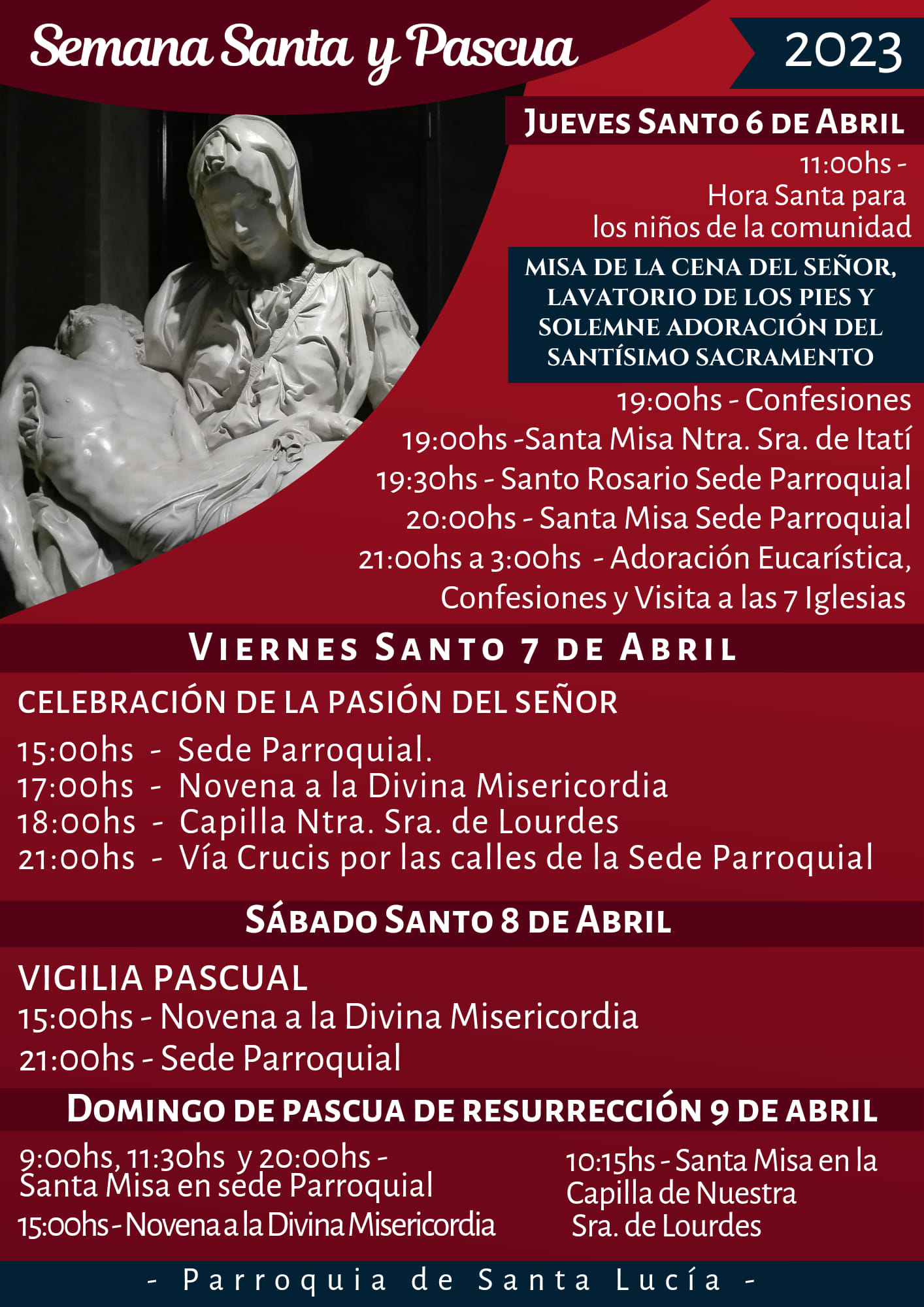 – Jueves santo 6 de abril: La celebración de la ultima cena, lavatorio de pies y institución de la Eucaristía.