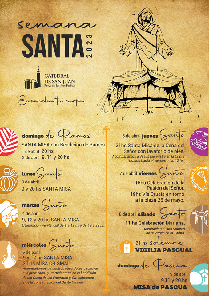 En vísperas de la Semana Santa -desde el 6 al 9 de abril-, el Arzobispado de San Juan de Cuyo informó cómo será el cronograma de celebraciones. Cabe recordar que en tal semana se conmemora la crucifixión de Jesús y su resurrección, fechas muy caras para el Catolicismo.