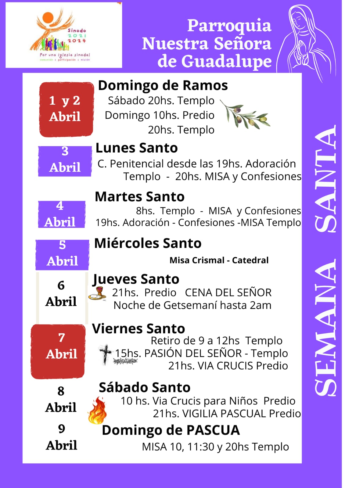 – Sábado santo 8 de abril: acompañamos en oración y silencio a la Virgen en sepulcro de Jesús a la espera de la resurrección.
