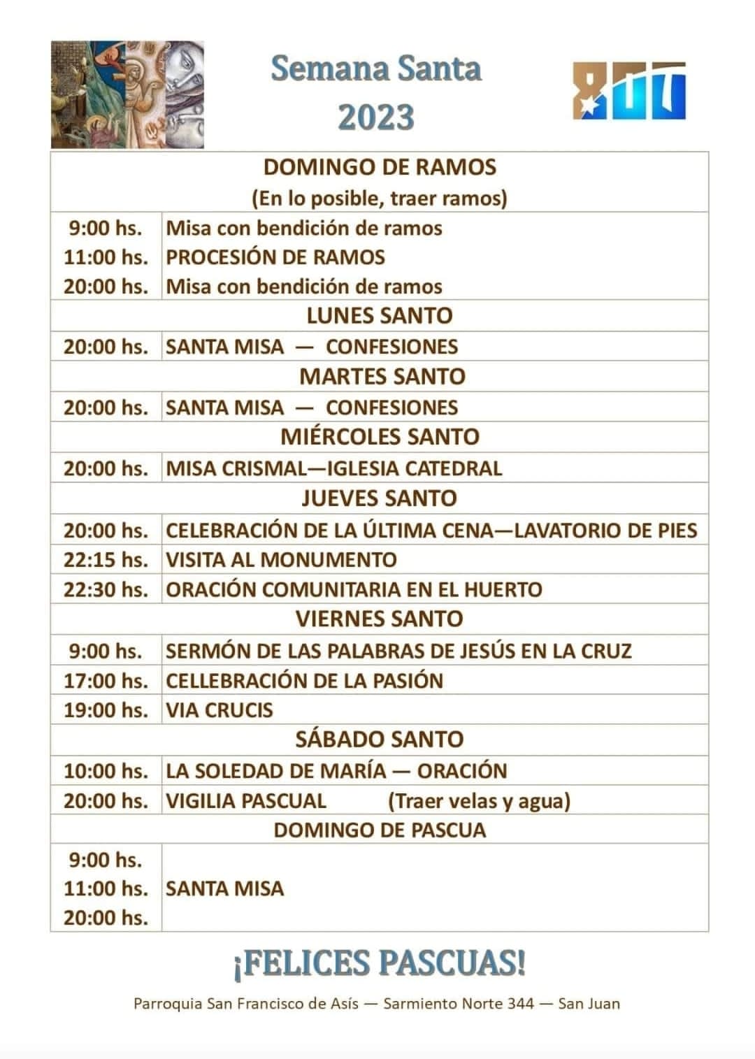 "Queridos amigos de la Iglesia de San Juan a continuación compartimos los programas de Semana Santa de las Parroquias y movimientos de la Arquidiócesis. Deseamos que este tiempo te permita acercarte más a Jesús resucitado", indicaron al difundir el cronograma.
