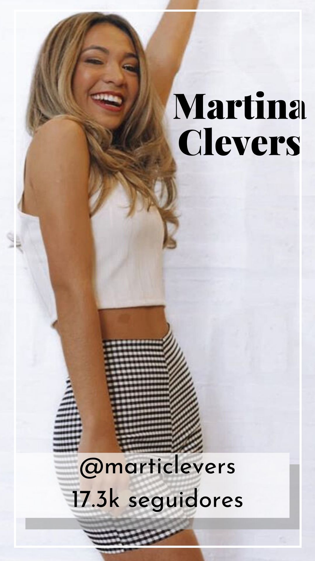 Todos le dicen "Marti" pero se llama Martina Nahir Clevers Naranjo. No está de novia, tiene 18 años y hace tres puso primera en Instagram, sin imaginarse jamás que en muy poco tiempo iba a superar los 17.300 seguidores, la marca que ostenta hoy en @marticlevers. Dice que la mayoría son hombres de entre 18 y 21 años, pero que la diferencia es mínima respecto al público femenino. Y se sorprende cuando las estadísticas le muestran que la siguen mucho en Buenos Aires.