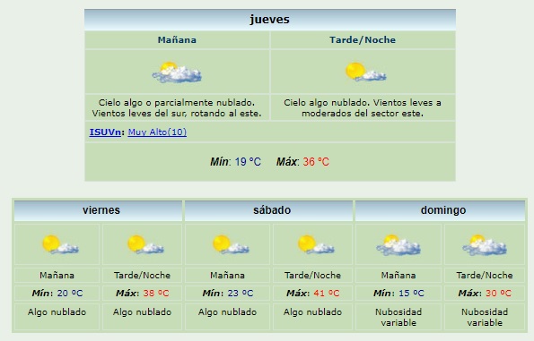Aire acondicionado, ventilador, pileta, agua, helados. Todo parece indicar que nada alcanzará para paliar el calor que la madre naturaleza tiene previsto regalarnos el próximo sábado. Según informó el Servicio Meteorológico Nacional, la temperatura máxima de ese día superará los 41º, ideal para no salir de casa o al menos tomar los recaudos necesarios para no sufrir un golpe de calor.
