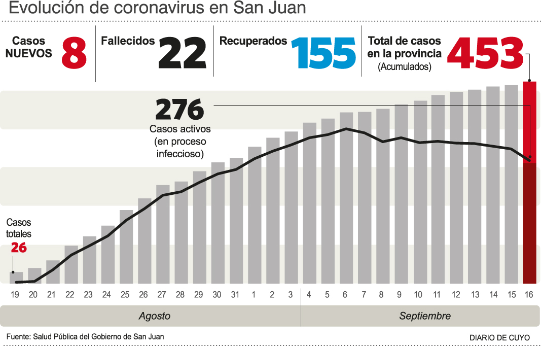 La curva de recuperados sigue así en aumento, tras el brote de contagios generado en Caucete el mes pasado y que se expandió por varios departamentos. Los 34 de ayer representan el número más alto alcanzado en un día y el casillero de recuperados ahora tiene 155 sanjuaninos.