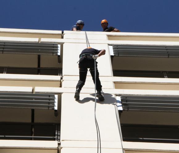 Fueron unos 30 bomberos los que participaron en un simulacro que pareció una película de catástrofes. Con música de suspenso de principio a fin, los hombres mostraron sus destrezas. Como lagartijas se deslizaron por los cinco pisos del Cívico. Primero lo hicieron con el rapel llamado panameño que es cuando se desciende de frente. Luego mostraron el modo clásico, que fue el descenso de espalda. Para terminar el ejercicio, bajaron a cuestas los “supuestos heridos”, desde el primer piso. Pero el broche de oro fue la tirolesa que atravesó toda la Plaza Seca. Esta técnica fue usada para transportar una camilla con otro “herido”. Mientras que algunos efectivos de la fuerza descendían en rapel, otros estaban apostados en la Plaza con las mangueras apuntando al edifico.