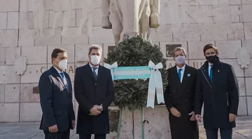 Como es tradición, el gobernador Uñac colocó una ofrenda de laureles en el monumento del fundador de San Juan, Juan Jufré. Y en este marco, se entonaron las estrofas del Himno Nacional.