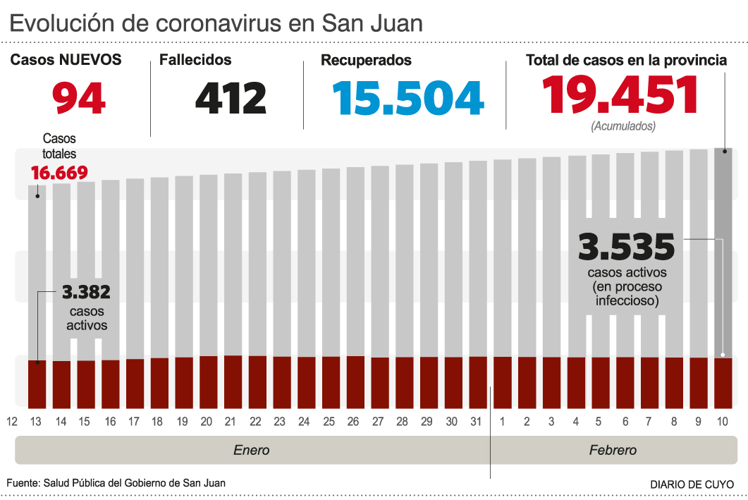 El parte que emitió el Ministerio de Salud Pública arrojó que nuevamente la cantidad de casos diarios no superó el centenar de personas y que San Juan tuvo otra jornada sin fallecidos a causa de Covid-19. Según el informe sanitario, ayer hubo 94 nuevos positivos y por lo tanto el acumulado en la provincia asciende a 19.451 contagios, por lo que se sostiene el aplanamiento en la curva.