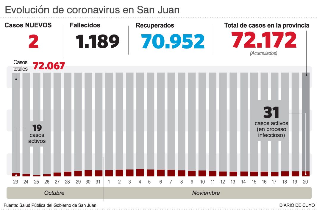 Los dos casos de covid aparecieron luego de procesar 186 test en la provincia, a la vez que el acumulado ahora tiene 72.172 infectados. Por su parte, las personas que están atravesando la enfermedad son 31, en tanto que hay 24 pacientes internados en las áreas de covid-19 de hospitales y sanatorios (entre positivos y sospechosos). De ese total, 17 personas permanecen internados en área crítica, 2 de los cuales se encuentran con asistencia respiratoria mecánica. La ocupación de camas UTI con pacientes covid es del 4,9%, por lo tanto hay 161 camas disponibles tanto en el sector público como el privado. A su vez, el total de fallecidos se mantiene en 1.189.