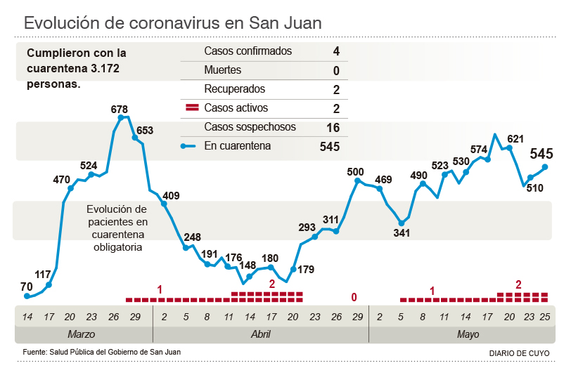 La primera de las dos semanas que las autoridades sanitarias consideraron cruciales tras detectar el cuarto caso de coronavirus en San Juan pasó sin nuevos infectados, o al menos sin contagios detectados, de acuerdo al parte que emitió ayer el Ministerio de Salud Pública. Así, la provincia mantiene dos pacientes con la enfermedad en curso, internados en el hospital Rawson, y cuenta con 16 sospechosos en proceso de laboratorio.
