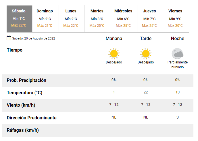 Para hoy está previsto un día más que agradable, ya que el Servicio Meteorológico Nacional indica que la máxima de este sábado será de 22°C mientras que la mínima caerá hasta 1°C.