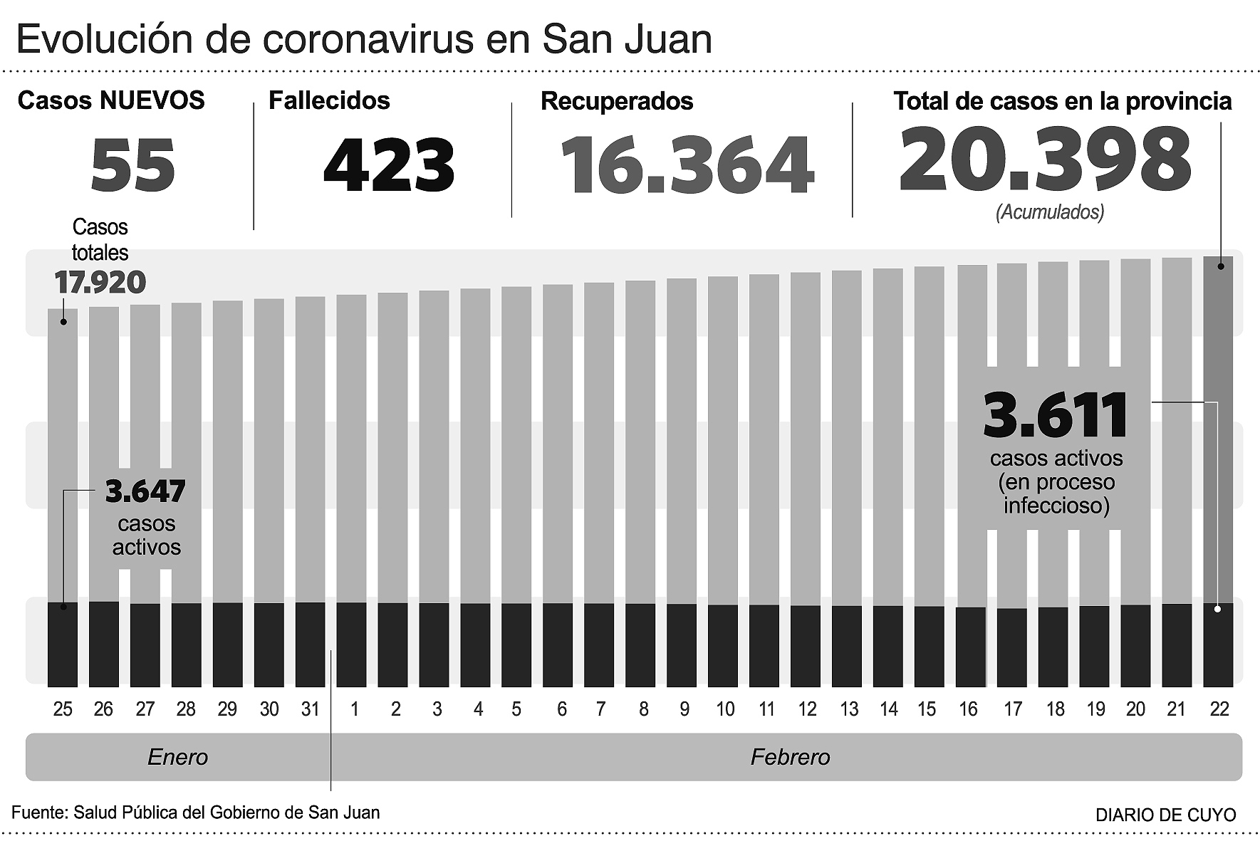 El Ministerio de Salud Pública informó ayer que fueron detectados 55 casos y hay que remontarse a más de cuatro meses para encontrar una cifra similar. Con esta cantidad de positivos, el acumulado en la provincia ahora es de 20.398 contagiados. A su vez, después de dos días seguidos sin fallecidos, ayer reportaron otro deceso. Se trata de un hombre de 78 años, oriundo de Chimbas, quien estaba internado en la Clínica Santa Clara. De esta manera, ahora los decesos en la provincia suman 423, de acuerdo a las autoridades.