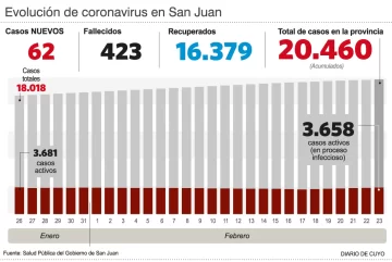 Por otro lado, ayer fueron confirmados 62 nuevos casos, para un acumulado de 20.460, en otra jornada de pocos positivos diarios. En tanto, hay 3.658 personas con proceso infeccioso en curso.