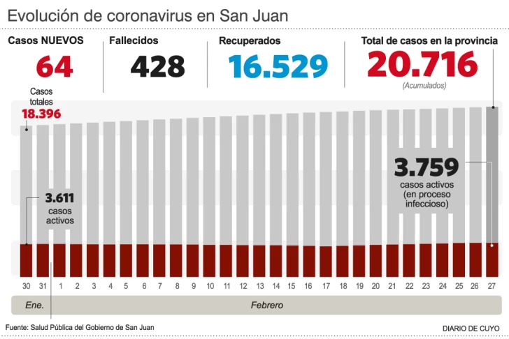 El Ministerio de Salud Pública reportó ayer sólo 64 casos de coronavirus, en tanto que no hubo decesos, de acuerdo al parte diario. De esta manera, San Juan mantiene la tendencia de menos de 70 confirmaciones diarias y con los de positivos de ayer, el acumulado asciende a 20.716 contagios. Febrero se encamina así a un cierre con menos cantidad de casos y fallecidos, que de hecho ya venía a la baja en enero con respecto a los últimos meses del 2020.