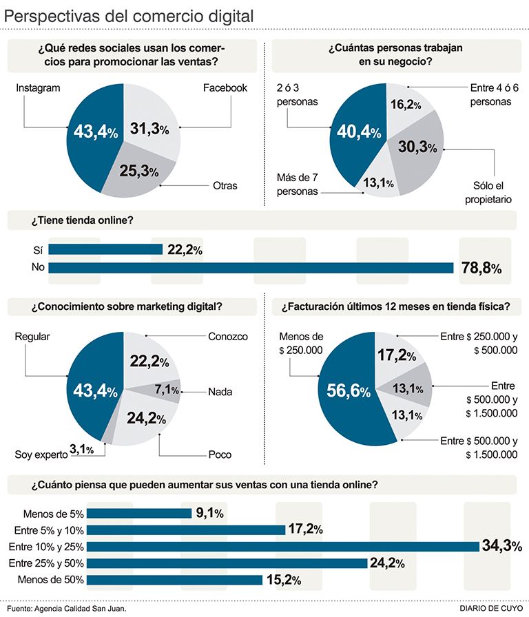 En medio del aislamiento social, cuando contados negocios pudieron abrir sus puertas, como ferreterías y farmacias, y para el resto el desarrollo del comercio electrónico hubiera sido una excelente oportunidad para realizar ventas, una encuesta encargada por el Gobierno provincial reveló que de 256 negocios relevados, sólo 56 (22%) tienen tiendas digitales, y que en unos 80 (31%) saben entre poco y nada de comercio digital. En 110 (43%) tienen un conocimiento regular.
