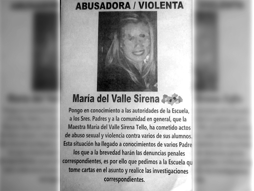 Acoso. A principio de mes aparecieron afiches con la foto de María del Valle Sirena, maestra jardinera, donde se la acusaba de abusar sexualmente de sus alumnos. Ella denunció a su expareja, Diego Uñates, como autor de este hecho.