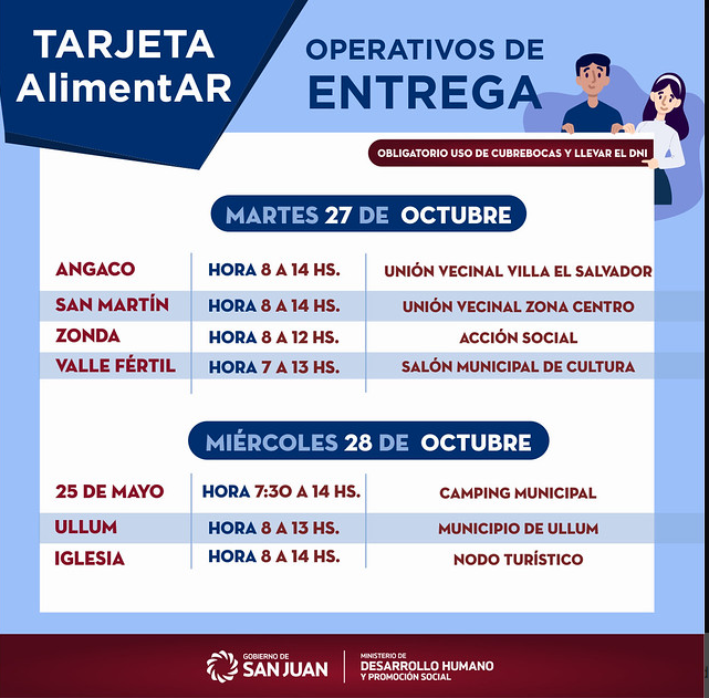 El padrón nacional de la Tarjeta AlimentAR se actualizó y por eso produjeron bajas y altas de beneficiarios. Como consecuencia a San Juan le corresponden poco más de 5.200 plásticos nuevos. Para entregarlos, respetando todos los protocolos sanitarios previstos por el Gobierno provincial, se ha diseñado un operativo que se desarrollará de manera simultánea en toda la provincia.