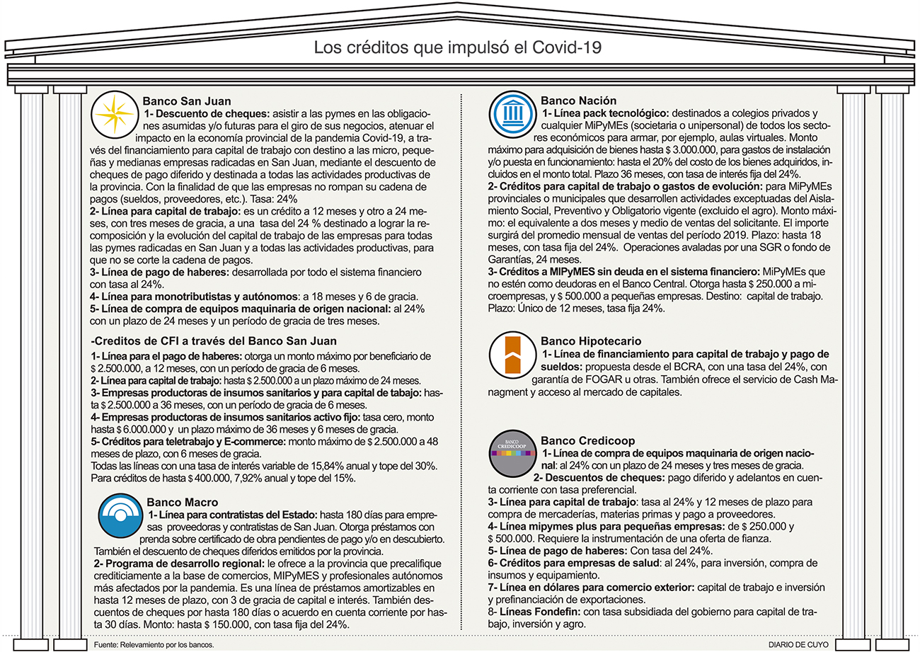 Para que la economía aguante con vida la crisis durante la pandemia del Covid-19 el Gobierno nacional le pidió a los bancos que acerquen liquidez, y a tasas accesibles; tanto a los autónomos como a las pymes grandes o chicas. Si bien apenas arrancó la cuarentena tardó en llegar la asistencia financiera y los empresarios sanjuaninos se quejaron de que no conseguían los préstamos para pagar salarios que anunció el Banco Central, con el tiempo los mecanismos se fueron aceitando. Actualmente las entidades financieras despliegan una amplia oferta crediticia para afrontar los vaivenes financieros del coronavirus, con tasas fijas que no superan el 24%, y con plazos de gracia que van de 3 a 6 meses (ver infografía). Existen al menos 24 líneas financieras disponibles hoy por hoy en cinco entidades, según expusieron varios bancos en la mesa del sector financiero por el Acuerdo San Juan, o bien contestaron a este relevamiento. Las diversas propuestas brindan un amplio abanico de destinos: no sólo que algunos continúan con las líneas de créditos para pagar sueldos, sino que también se pueden encontrar fondos para comprar equipos de computación para desarrollar el teletrabajo en colegios privados o empresas, comprar maquinarias de fabricación nacional, o adquirir insumos en los sanatorios. Incluso los contratistas o proveedores del Gobierno de la provincia pueden lograr financiamiento con prenda sobre el certificado de obra que emite el gobierno, una de las ofertas del Banco Macro. El gerente del Banco Nación, Pablo Alvarez; explicó que una de las líneas "estrella" destinada a la compra del pack tecnológico para teletrabajo o clases on line, por hasta $3 millones; se pensó inicialmente para ofrecer asistencia crediticia a los más de 170 establecimientos educativos que hay en San Juan. "El educativo es uno de los sectores que más sufre la pandemia y creemos que de alguna manera esta explosión de clases virtuales ha llegado para quedarse, aún en el escenario poscovid", dijo. Claro que el banco también lo otorga a cualquier otra empresa, aunque no sea educativa.