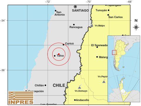 El epicentro se ubicó 367 kilómetros al Sudoeste de Mendoza; 499 kilómetros al Nortoeste de Neuquén; y 20 kilómetros al Este de Talca, en el vecino país.