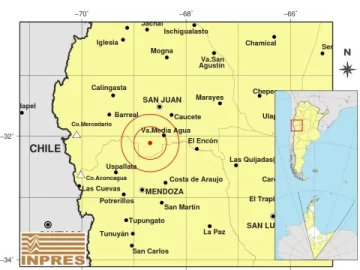 El epicentro fue 69 km al S de San Juan; 85 km al N de Mendoza; 29 km al SO de Va.Media Agua, en el departamento Sarmiento.