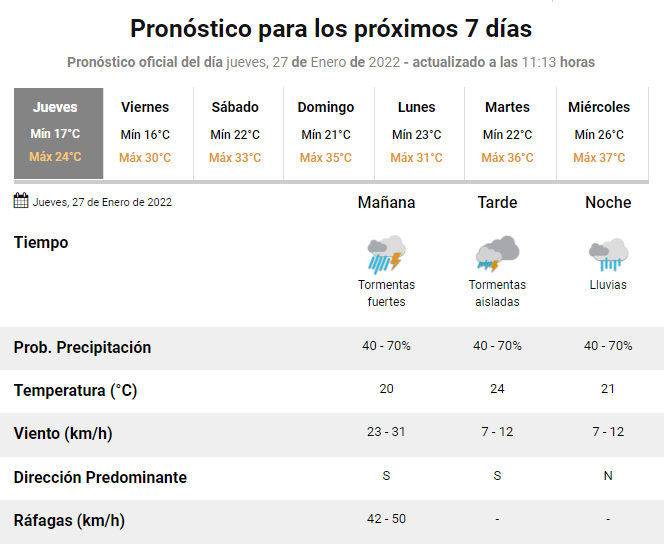 En cuanto al sábado, se prevé que el termómetro llegue a los 33 grados, sin lluvias y con el cielo mayormente nublado durante toda la jornada.