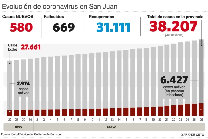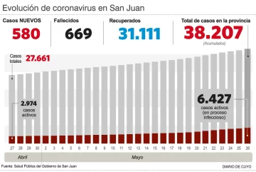 Por otro lado, fueron informados 580 nuevos casos de coronavirus y por lo tanto el acumulado ahora es de 38.207 infectados. De ellos, hay 6.427 casos activos y con el aumento de los contagios sigue creciendo la cantidad de personas internadas.