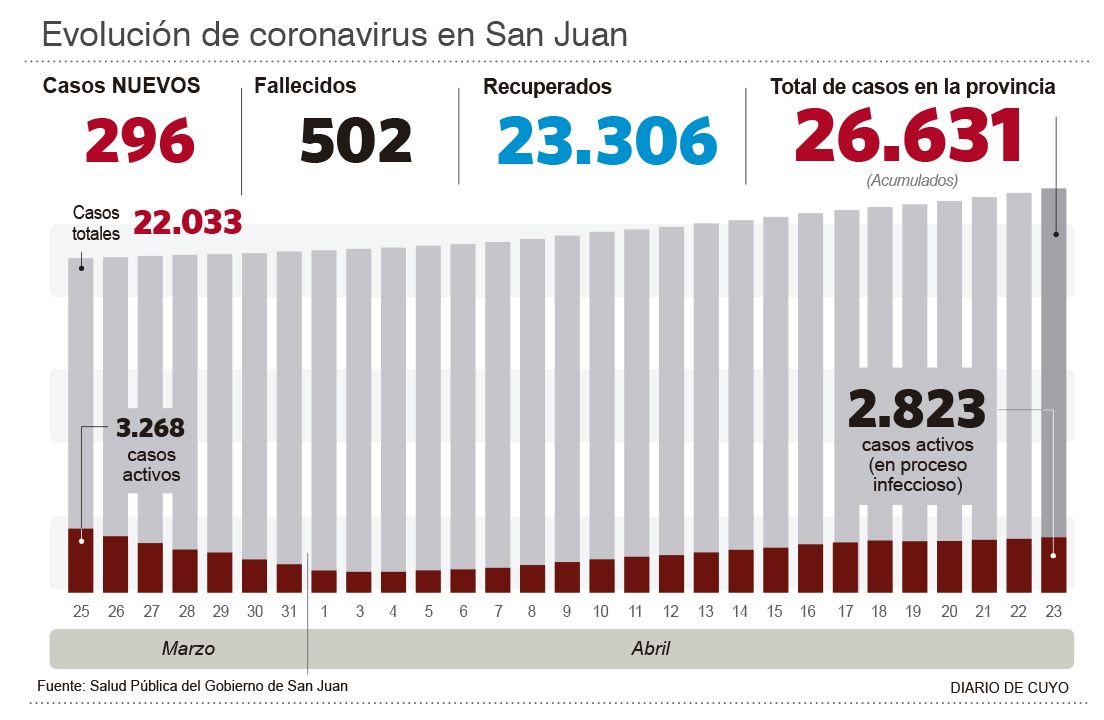 A su vez, fueron detectados ayer 296 casos de coronavirus y el acumulado ahora es de 26.631. De ellos, hay 2.823 personas con proceso infeccioso en curso, aunque la cantidad de pacientes internados se mantuvo estable, pues son 166.
