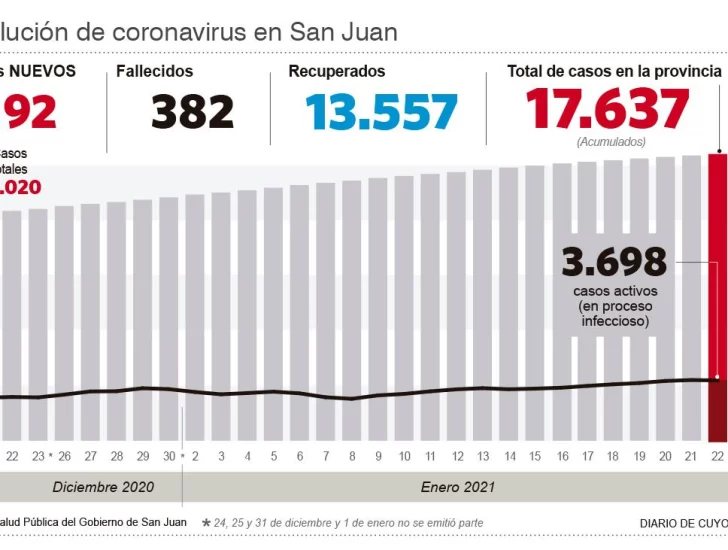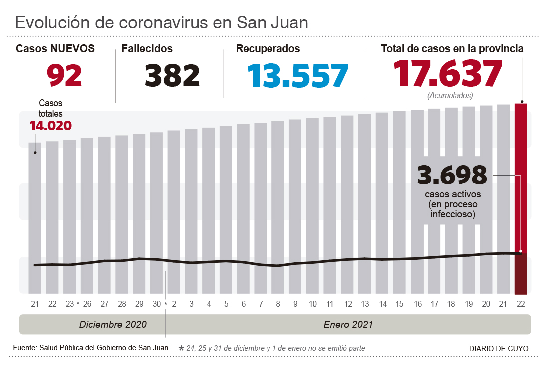 En una clarísima curva descendente de la pandemia en San Juan, ayer Salud Pública reportó 92 nuevos casos de Covid, en lo que fue la tercera jornada consecutiva (y la cuarta en los últimos cinco días) con menos de 100 contagios diarios.