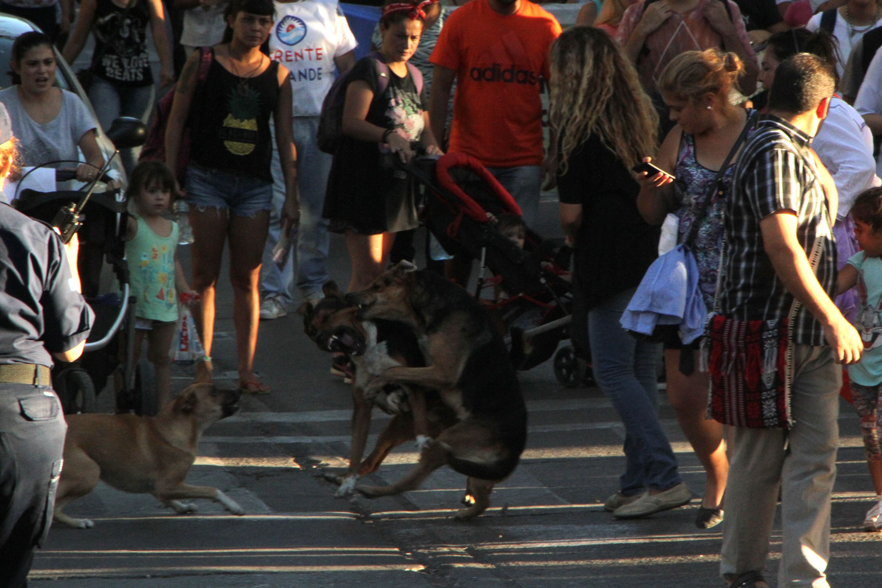 Disipar la pelea fue una dura misión. Es que uno de los perros tenía agarrado con sus dientes al otro y no lo soltaba. Los manifestantes les tiraron agua y los tomaron del torso para alejarlos. Incluso uno de los asistentes golpeó a los animales, lo que generó un repudio general.