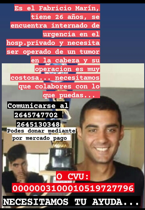 Hace unos meses, Fabricio Marín, quien se desempeña como empleado del Servicio Penitenciario y tiene 26 años, comenzó a sentirse mal. Consultó al médico, pero lo mandaron a su casa. Su situación empeoró, pero seguía sin recibir el diagnóstico adecuado. Eso hasta el jueves pasado, cuando sufrió una nueva descompostura y finalmente le realizaron estudios. Descubrieron que tiene un tumor en la cabeza. Como consecuencia deben operarlo este miércoles, pero necesita gran cantidad de dinero, que no tiene. Desesperada, su familia decidió pedir ayuda.
