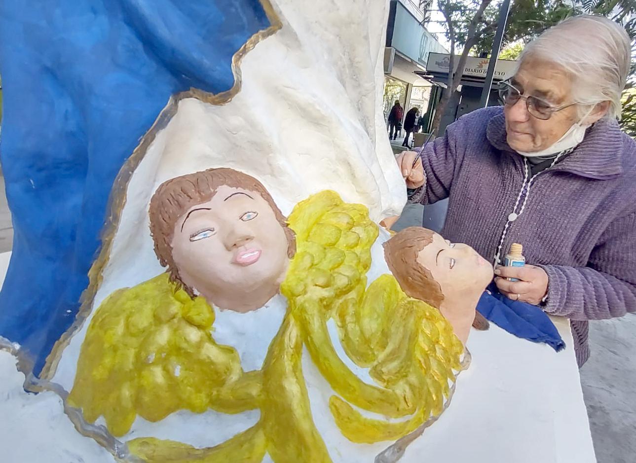 No puede avanzar rápido con su tarea pese a los esfuerzos. Es que "los años no vienen solos", dice, y ya hasta le cuesta deslizar el pincel sin que le duela. Sin embargo no se detiene porque su misión es dejar a María como nueva, tal como le "encomendó Dios". Es Amalia Correa, una mujer de 80 años que está restaurando la imagen de la Virgen María Auxiliadora que está en la peatonal céntrica, trabajo que asumió sin conocimiento alguno, con recursos propios y, según dijo emocionada, porque se lo encomendó el Señor.