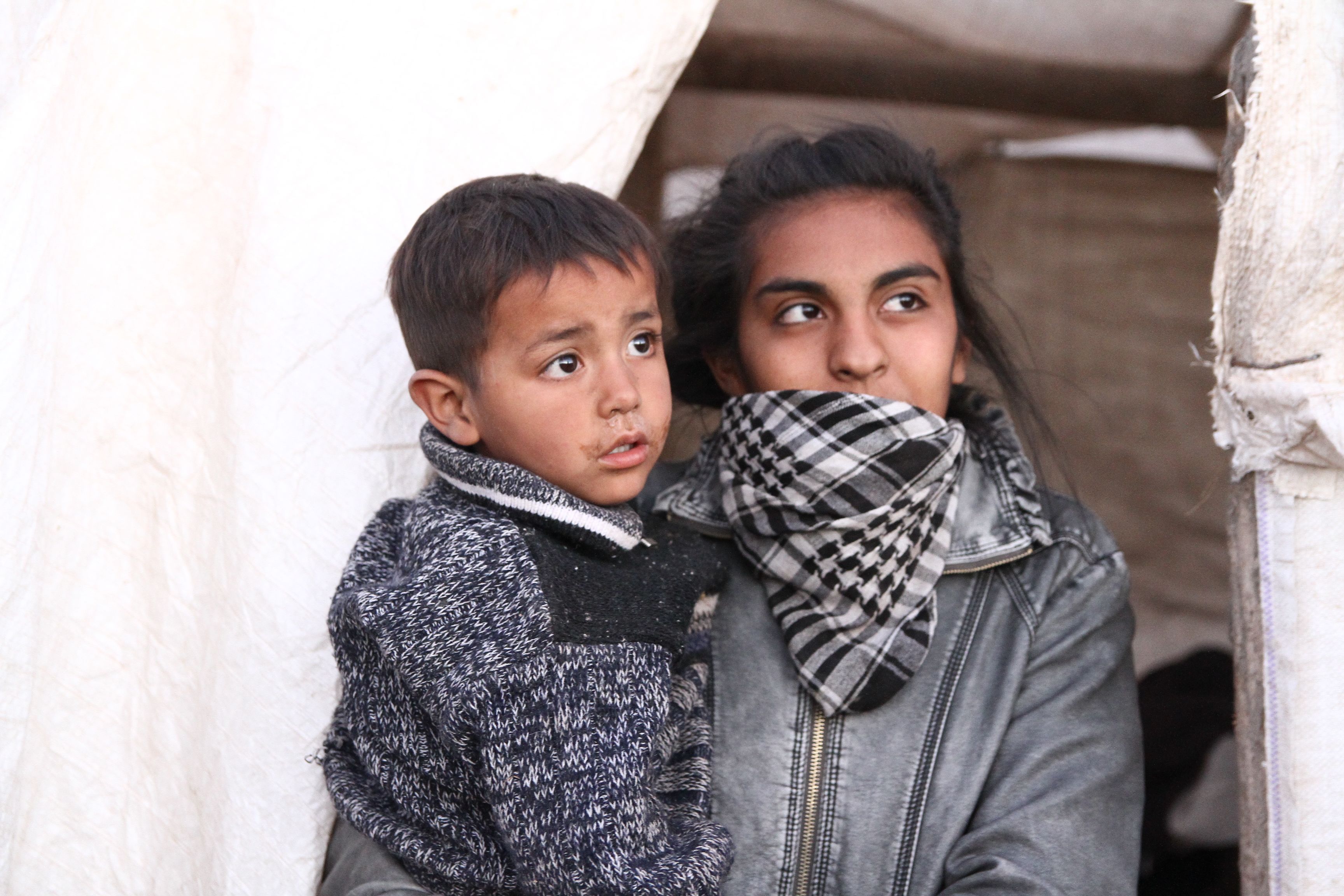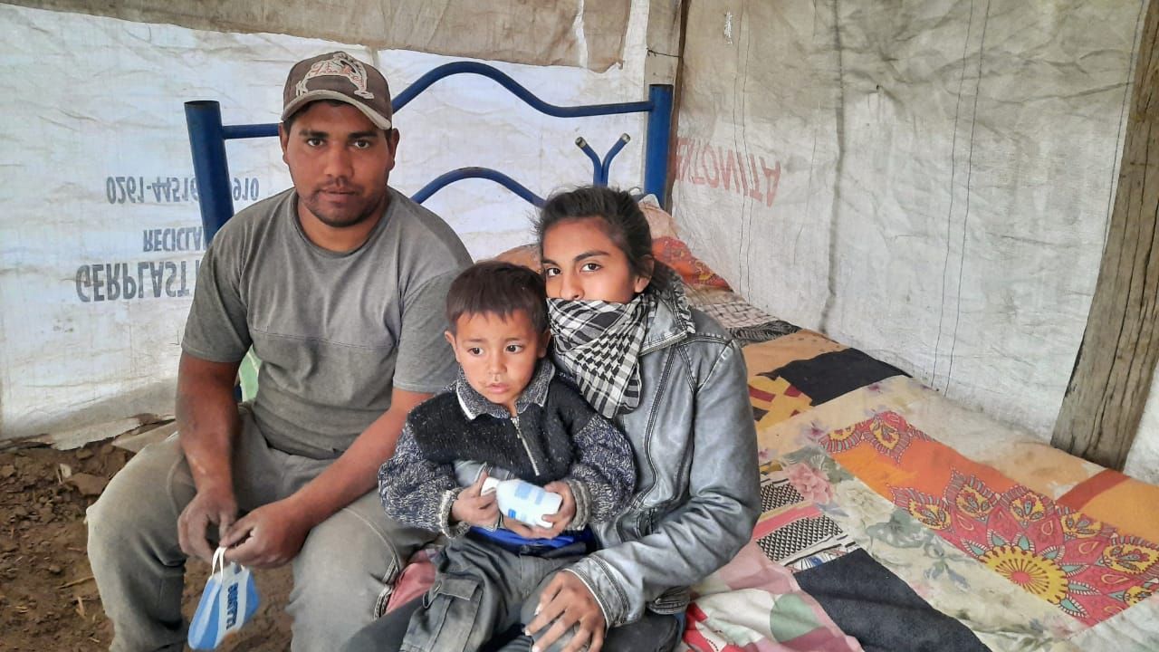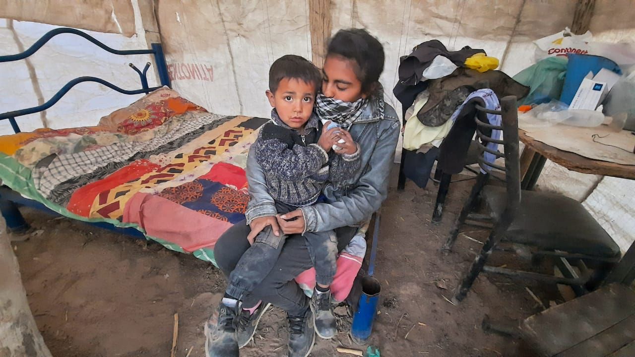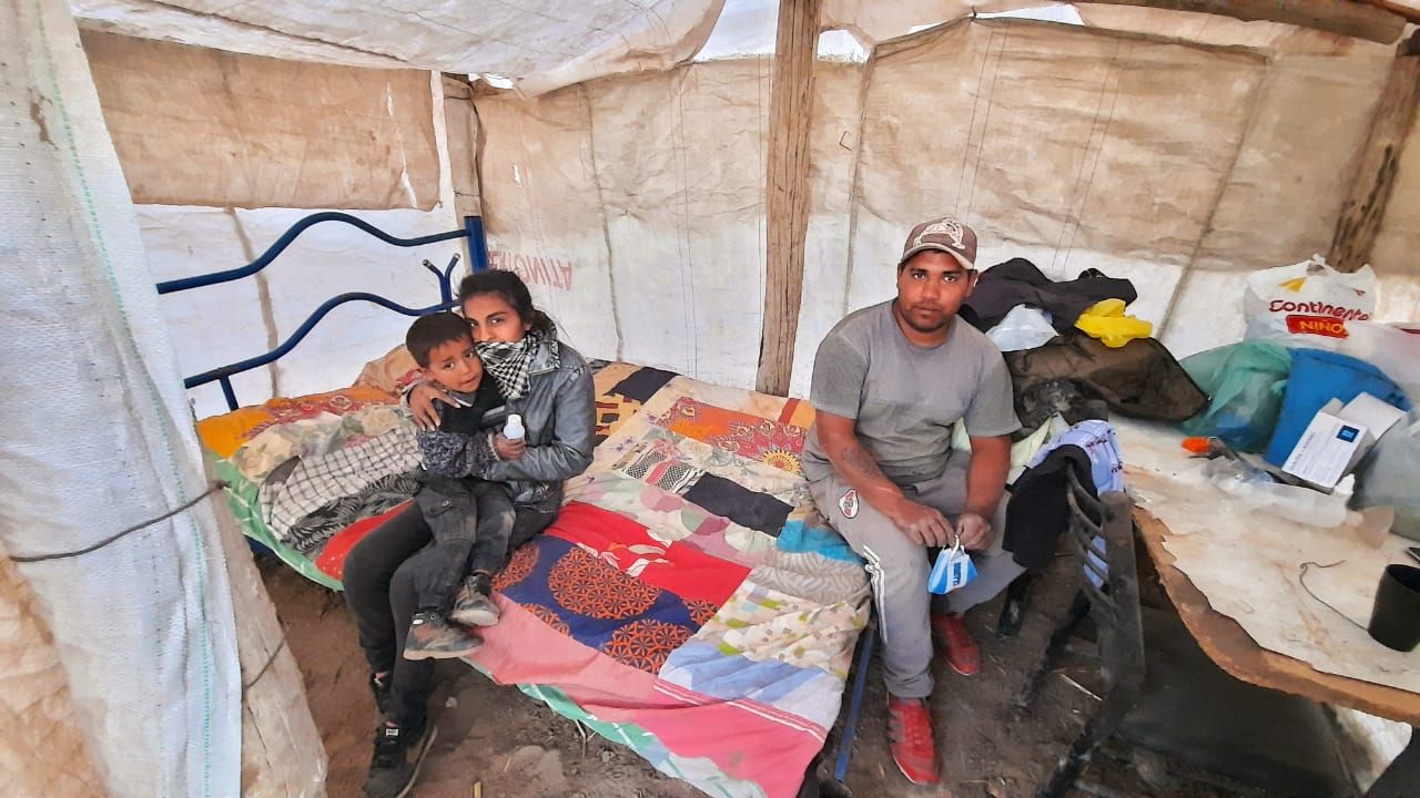 Luis Roberto Araya (22) mira la pieza y abraza a su chiquito, llamado Luis Javier. Melani Malla (20) admite que estuvo llorando. Los tres tienen las zapatillas llenas de tierra.