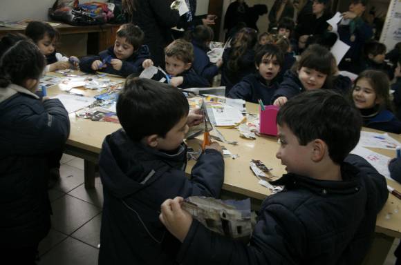 Si el curso visitante está integrado por niños pequeños, las actividades se dividen entre pintar y rearmar secuencias y recortar imágenes de revistas para pegarlas y adornar una carpeta. En cambio, si el grupo está integrado por chicos que saben leer se hace trabajos de lecto-escritura o de armado de adornos con materiales reciclados.
