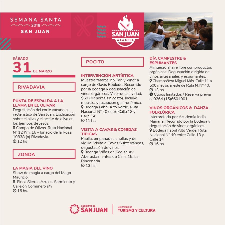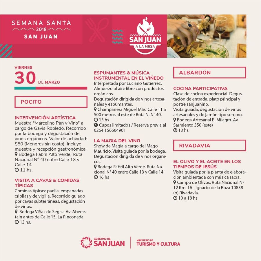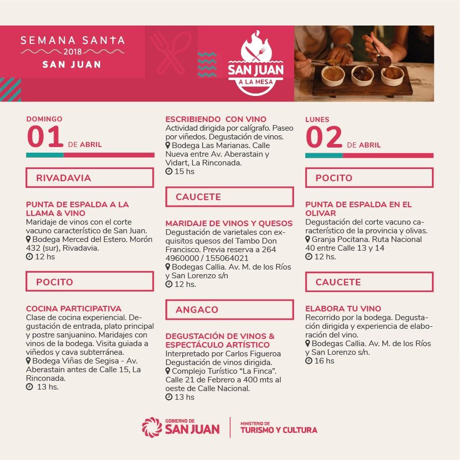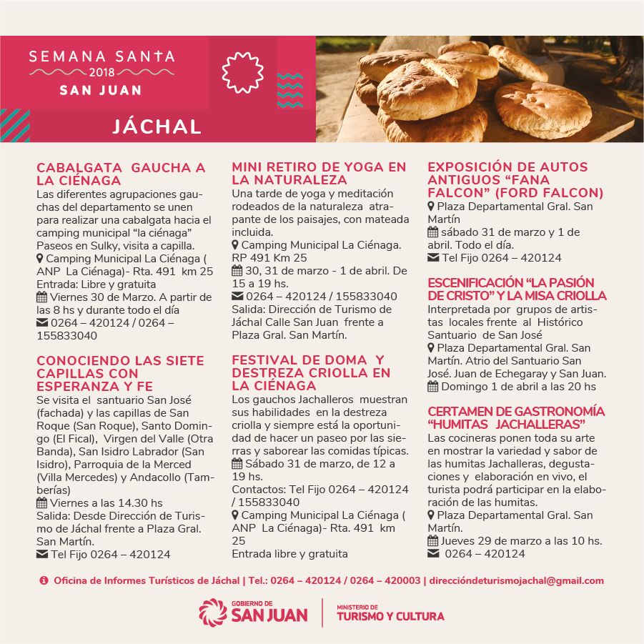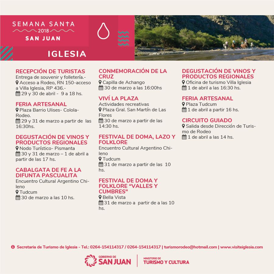Gastronomía regional, actividades religiosas y culturales y turismo de aventura son parte de las actividades que organizaron el Ministerio de Turismo, los municipios y los prestadores de la provincia organizaron para que los sanjuaninos y turistas disfruten Semana Santa en la provincia.