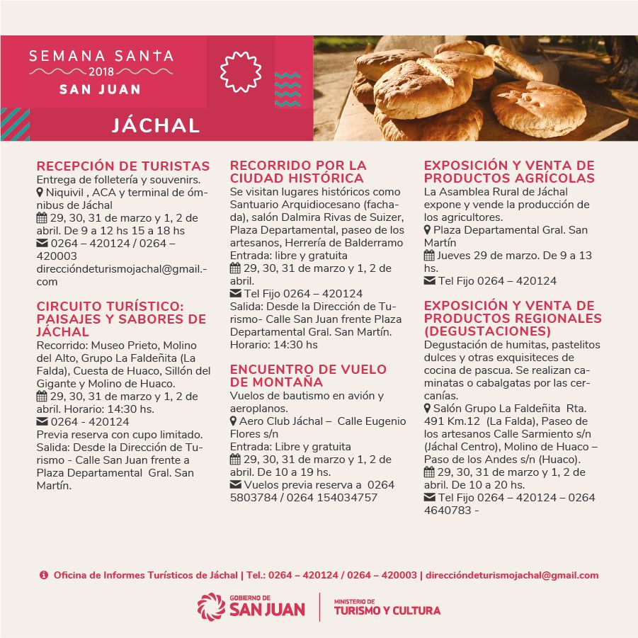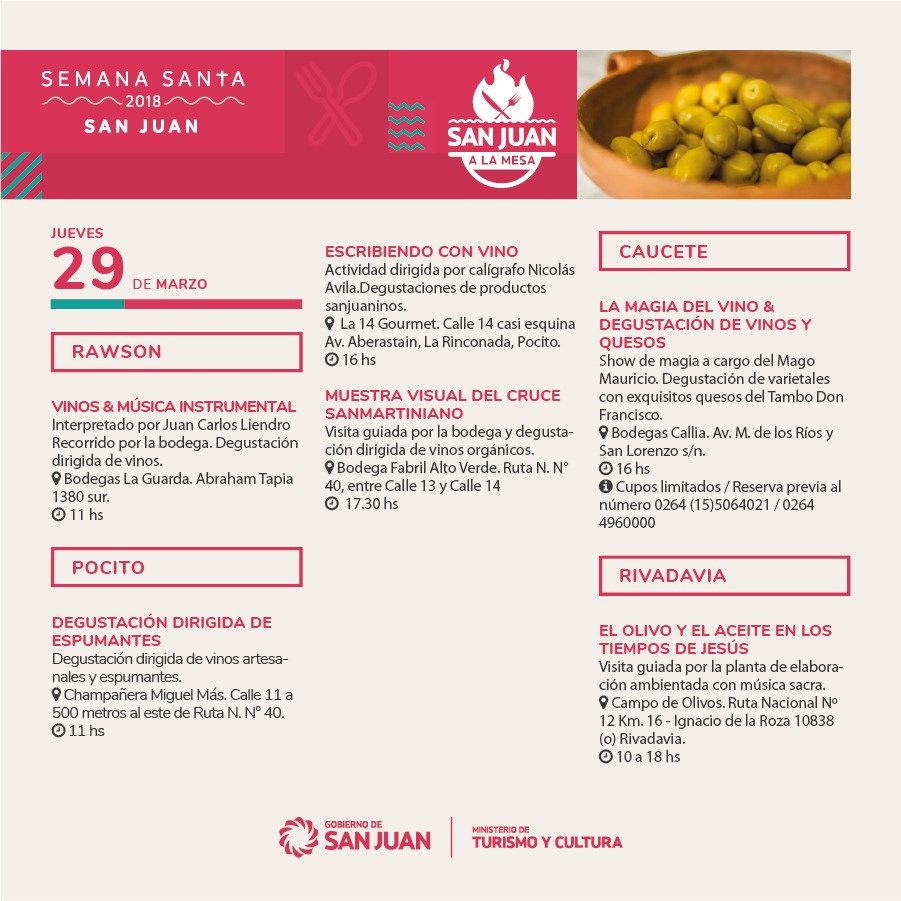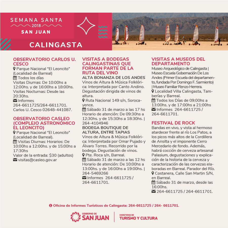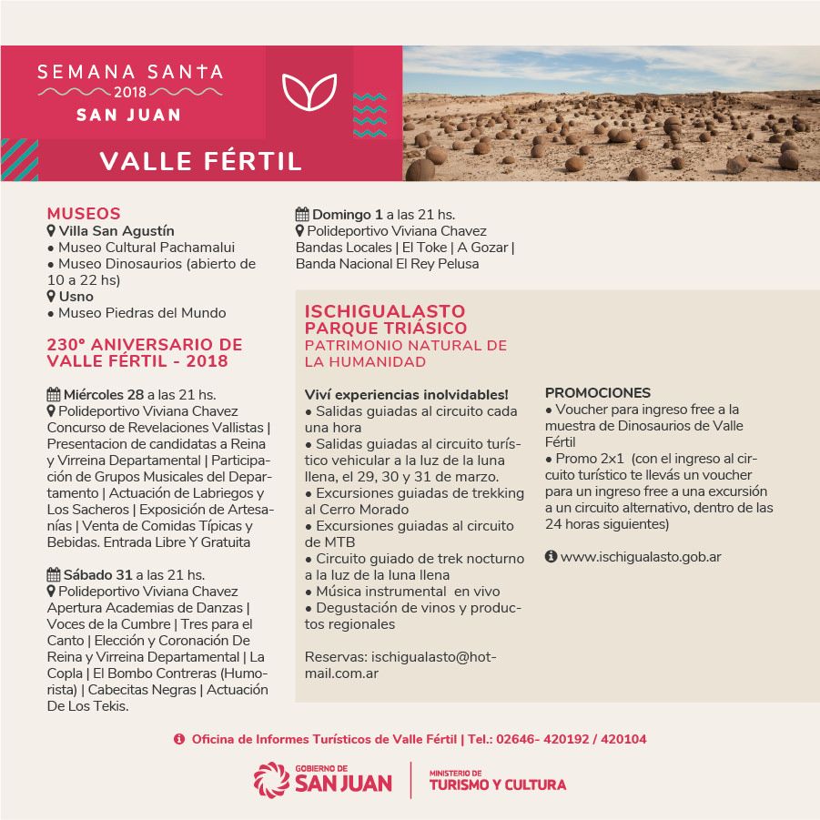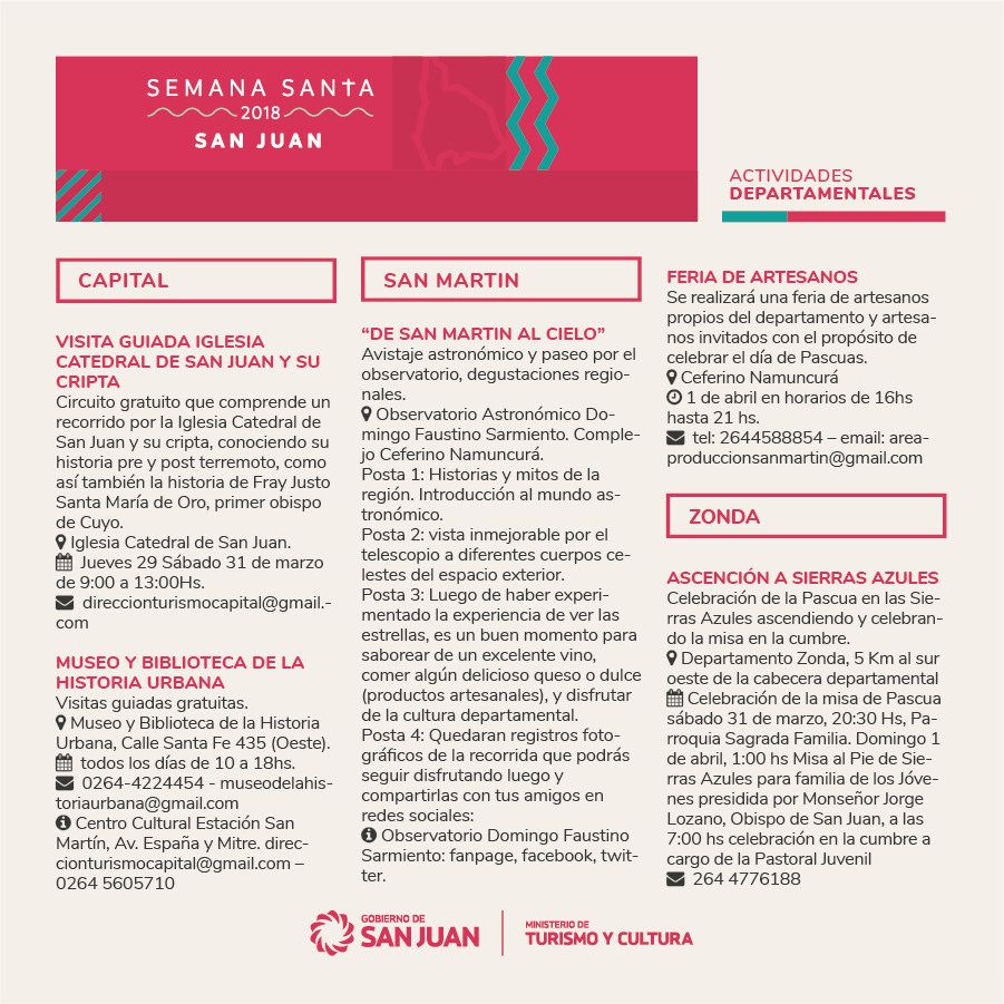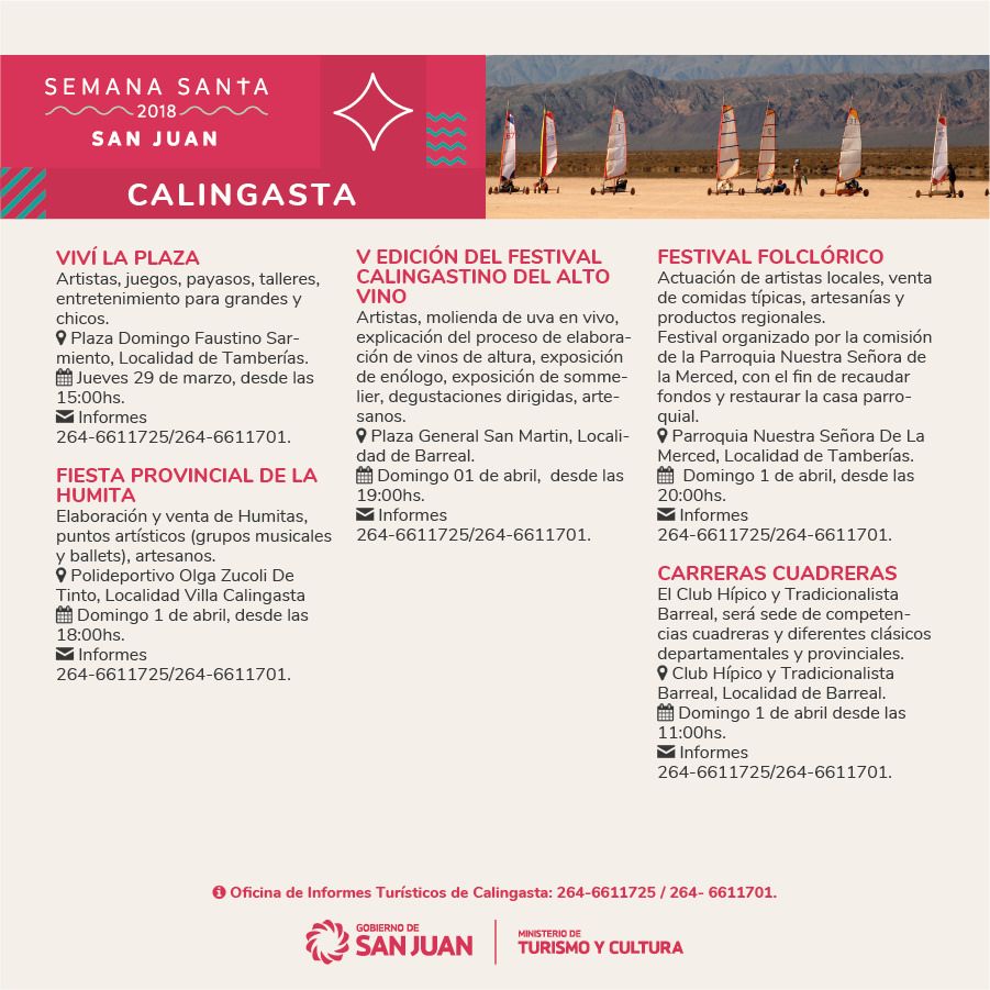Gastronomía regional, actividades religiosas y culturales y turismo de aventura son parte de las actividades que organizaron el Ministerio de Turismo, los municipios y los prestadores de la provincia organizaron para que los sanjuaninos y turistas disfruten Semana Santa en la provincia.