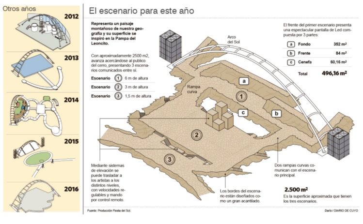 El escenario que este año será más grande que otras ediciones y estará más cerca de la gente que se ubique en el cerro, gratis. El lugar donde actuarán unos 450 artistas representa un paisaje montañoso. Según la ministra de Turismo, Claudia Grynszpan este escenario está inspirado en la Pampa del Leoncito, de Calingasta.