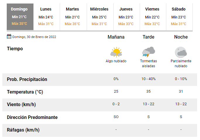 Luego de varios días cargados de lluvia, para este domingo se prevé que el agua se vuelva a hacer presente pero en la tarde-noche. Según lo que prevé el Servicio Meteorológico Nacional, la máxima se elevará hasta los 35°C mientras que la mínima caerá hasta los 21°C.