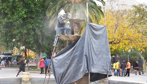 San Juan.- Un nylon negro cubre la escultura interna de la fuente y, sobre una escalera, un hombre enmascarado trabaja puliéndola. Los sapitos no están. Mientras, otro equipo pinta los bancos, cestos y farolas. De ese modo, trabajan los empleados de la Municipalidad de la Capital que están hermoseando la plaza 25 de Mayo. La idea, según las autoridades, es realizar la misma tarea en las plazas principales de los 4 distritos del departamento.
