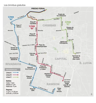 Nuevamente habrá 3 líneas de colectivos para el traslado gratuito de la gente hasta el Costanera Predio Ferial San Juan, durante las 5 noches de la Fiesta Nacional del Sol. Serán 340 unidades que saldrán de distintos puntos (ver infografía) desde las 19 hasta las 23. El horario de salida desde el predio será de 23 a 4 de la madrugada, todas las noches desde el acceso 4.