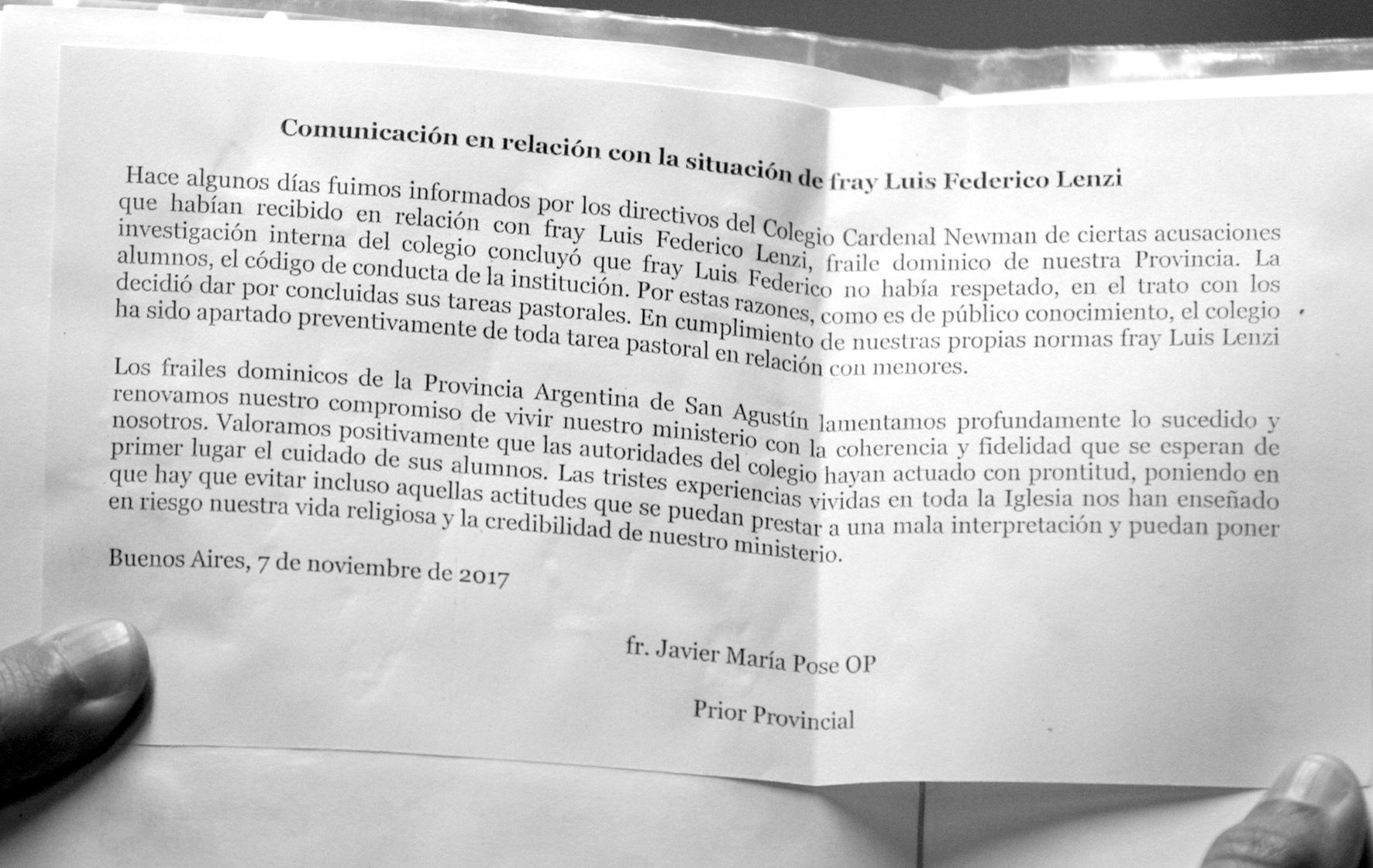 Desde el Colegio Santo Domingo también hablaron del tema y explicaron la decisión que tomaron (ver aparte), mientras que desde algunos medios nacionales aclararon que voceros del colegio de Buenos Aires dijeron que la separación de Lenzi no está vinculada a “casos de abuso sexual”.