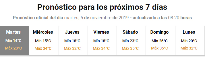 De acuerdo al pronóstico extendido, desde mañana el termómetro irá en aumento con una máxima prevista de 34 grados cielo algo nublado y viento del sector Sudeste por la mañana y del Este en la tarde-noche.