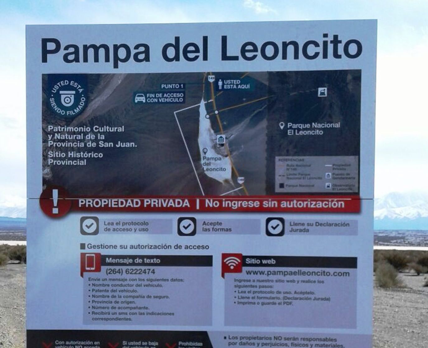 La Pampa del Leoncito es uno de los lugares más populares de San Juan a la hora de hablar de turismo. Y ayer se abrió una polémica porque los dueños del lugar colocaron un cartel que informa que nadie puede ingresar al predio sin antes registrarse a través de mensaje de texto o en una página web. Esta medida causó revuelo entre prestadores turísticos que incluyen los paseos por este sitio que es único en la provincia. "Si bien no están cobrando entrada muchas personas llamaron porque temen llegar a Calingasta y que no los dejen pasar a El Leoncito", dijo Jorge Castañeda, el intendente del departamento y comentó que le pidió al diputado por Calingasta, Alfredo Amín que acelere el tratamiento del proyecto de ley para declarar a este predio un lugar apto para la expropiación. En el mismo sentido, la ministra de Turismo Claudia Grynszpan dijo que esa ley es necesaria para que puedan tomar la administración del lugar, mientras que el diputado Amín comentó que fue el autor del proyecto de ley y que tras hablar con sus colegas se comprometieron a que en octubre la ley sea aprobada en el recinto. "Hay mucha voluntad política", agregó.