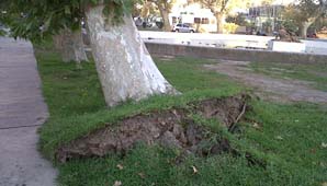 San Juan 29 de mayo.- Los daños provocados por uno de los vientos Zondas más fuertes de los últimos años todavía se pueden percibir en la vía pública. Si bien las áreas de servicios de los municipios salieron inmediatamente, todavía no logran mitigar los posibles peligros que quedaron tras el temporal. Un caso concreto es el Plátano que se encuentra arrancado de raíz en uno de los puntos más concurridos de la Capital, el Parque de Mayo.