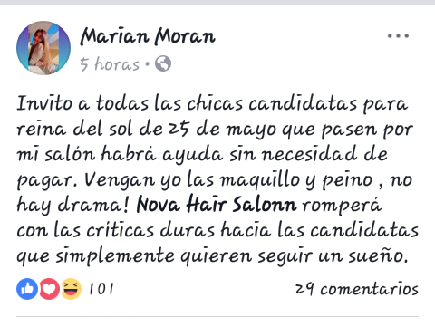 En ese contexto, a una joven caucetera propietaria de un salón de belleza la situación la conmovió y decidió solidarizarse con las aspirantes a la corona veinticinqueña. ¿Cómo? Ofreció atenderlas gratis en su espacio. "Invito a todas las chicas candidatas para Reina del Sol de 25 de Mayo a que pasen por mi salón, habrá ayuda sin necesidad de pagar", planteó Marian Morán en su cuenta de Facebook. "Yo las maquillo y peino, no hay drama", agregó.