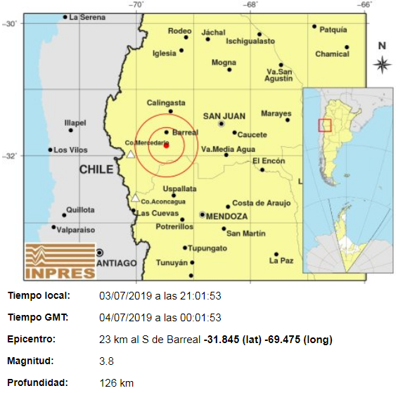 El primero ocurrió apenas unos minutos antes de las 19, precisamente a las 18.55, en Jáchal, justo en el límite con La Rioja. La magnitud fue de 2,6° y tuvo una profundidad de 10 km. Dos horas más tarde, dos temblores se sucedieron con 20 minutos de diferencia: a las 21.01, con una escala de 3,8, tuvo lugar en Calingasta, a 23 kilómetros de Barreal y con una profundidad de 126 km. El último, sucedió a 30 kilómetros al Este de Mogna. La magnitud fue de 3.1 y la profundidad fue de 87 km.