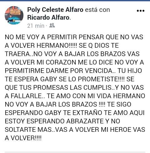 “No me voy a permitir pensar que no vas a volver hermano”, comenzó escribiendo la mujer en su perfil de Facebook. “Sé que Dios te traerá. No voy a bajar los brazos, vas a volver, mi corazón me lo dice. No voy a permitirme darme por vencida”, siguió.