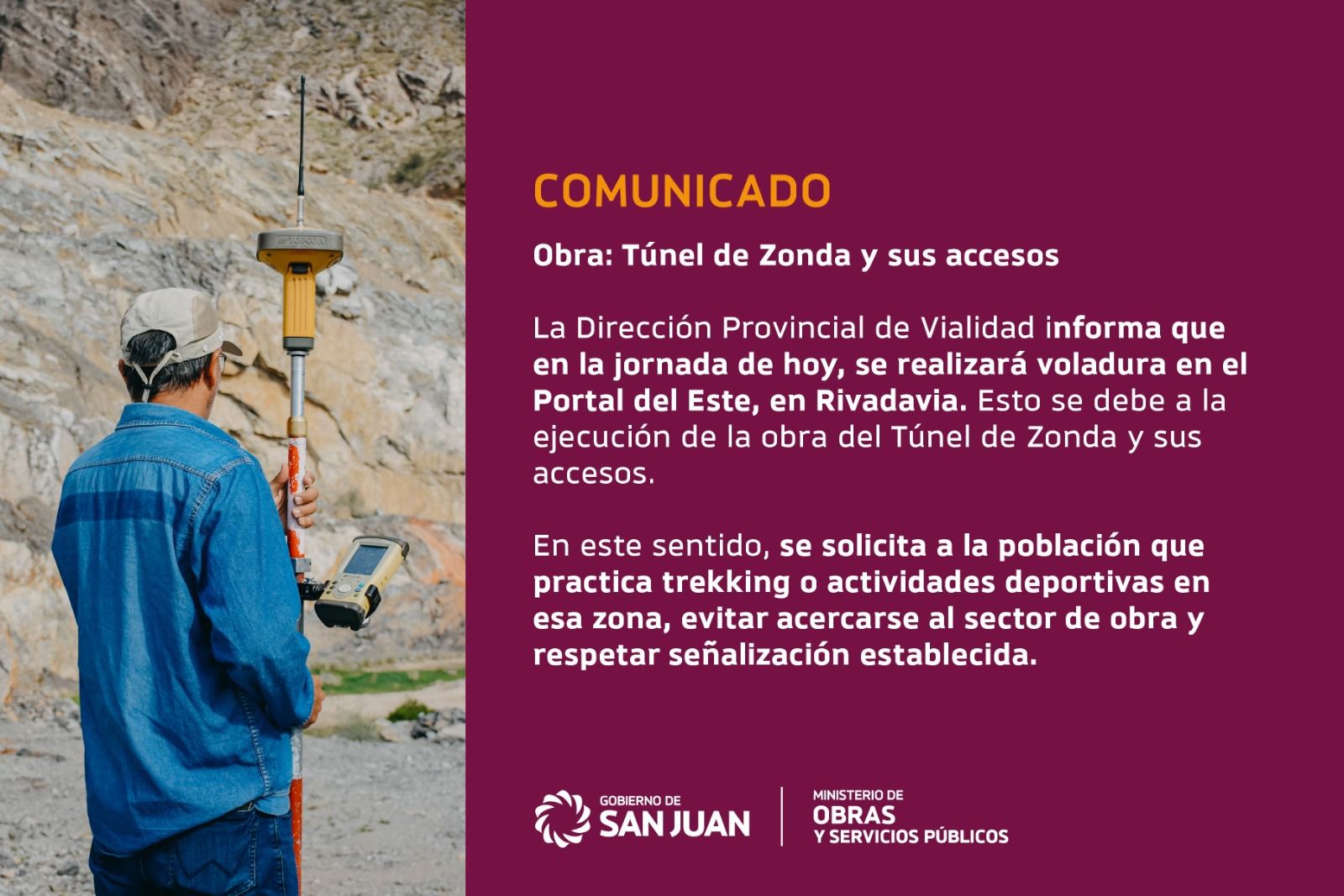 Este jueves, desde las 14, la obra del Túnel de Zonda tendrá un importante porque se llevarán adelante voladuras en la zona del Portal del Este, en Rivadavia, por lo que solictaron a aquellas personas que realizan deportes que no se acerquen a dichos lugares.