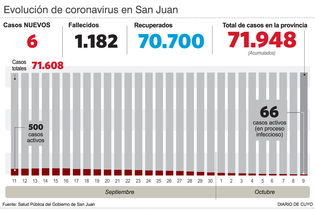 El Ministerio de Salud Pública comunicó que ayer no hubo decesos por covid, a la vez que sólo seis casos positivos fueron detectados, luego de 127 test. Con esta cifra, el acumulado ahora es de 71.948 infectados.