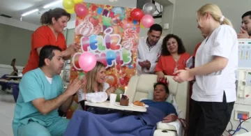 La celebración tuvo de todo, aunque por las características del lugar y del tratamiento se hizo con ciertas limitaciones. El personal rodeó a Dominga para acercarle la torta con la velita y cantarle el feliz cumpleaños. Los demás pacientes cantaron sin moverse de sus sillones porque ya estaban conectados a las máquinas y sin poder moverse.